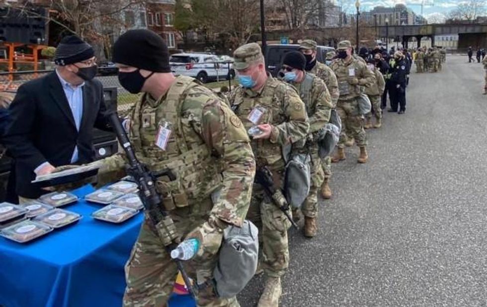 Of course the dangers of far-right violence persist. A group of about 20 Boogaloo Boys, armed with assault rifles and keen on the idea of civil war, turned up in Lansing, which has already seen its share of violence aimed at Gov. Gretchen Whitmer, but they quickly dispersed when confronted by troops. About the same number, likewise heavily armed, appeared in Columbus; they said they were there for a long-planned gun-rights rally on behalf of "everyone's individual liberties." In D.C., tensions remain high enough the presence of 25,000 National Guard has turned the city into "a war zone" and the FBI is now vetting them all, "taking second, third looks at every one," amidst fears of an insider attack during the inauguration. For now, officials say they've found no red flags, and Guardsmen are being well fed - "because of course" - by chef Jose Andres, omnipresent humanitarian hero, founder of World Central Kitchen, and "the best of us." As usual, Andres is providing not just food - in this case, to complement military rations with the help of local restaurants - but grace. With the singular ardor of an immigrant who dearly loves his adopted country, Andres offers both reassurance to his viewers - "They're being taken care of, so be relaxed" - and a stern lesson. "Democracy should be a celebration, when you win and when you lose," he declares. "And we shouldn't be needing the National Guard to be showing up at election time. This shouldn't be happening in the United States, ever again."