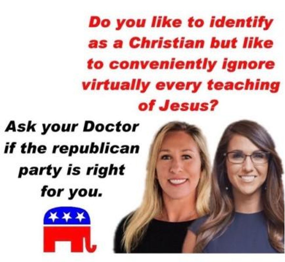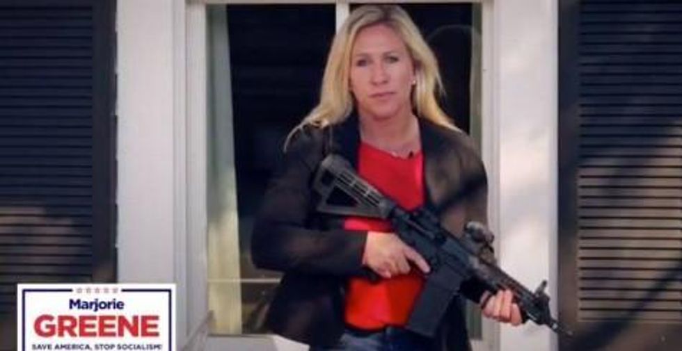 Despite admittedly stiff competition, QAnon clown and domestic terrorist Rep. Marjorie Taylor Greene definitively clinched the title of Most Ghastly and Inappropriate Person In Congress this week with a flood of revelations she's spent the last few years trying to get Democratic leaders executed, stalking survivors of school shootings she claims were staged, and proving, says Hillary Clinton, "This woman should be on a watch list. Not in Congress." Before she "won" her seat in Georgia's solid red 14th Congressional District when her Dem opponent dropped out, Greene had made a crackpot name for herself as an Internet provocateur boosting QAnon conspiracy theories about the cannibal/pedophile cabal run by elites - ie Democrats - that only god/king/Fuhrer Donald Trump could stop. She argued 9/11 was an inside job, Hillary had secretly killed a child in a Satanic ritual, an Islamic invasion would follow the 2018 mid-terms, ActBlue funded "Antifa/BLM terrorism," a random montage of angry black people in the streets proved "this is the Democrat (sic) party." In 2019, her White House petition sought to impeach Nancy Pelosi for "crimes of treason" for her support of sanctuary policies "serving illegals and not United States citizens," arguing Pelosi "gives aid and comfort to our enemies who illegally invade our land" and "It's, uh, it's a crime punishable by death is what treason is"; in another broadcast, she said the House speaker will "suffer death or she'll be in prison" for her "treason," ditto Rep. Maxine Waters. She also filmed herself roaming the halls of Congress to make Muslim Reps. Omar and Tlaib retake their oaths of office on a Bible, not a Quran, "so they're following our laws," which don't exist.