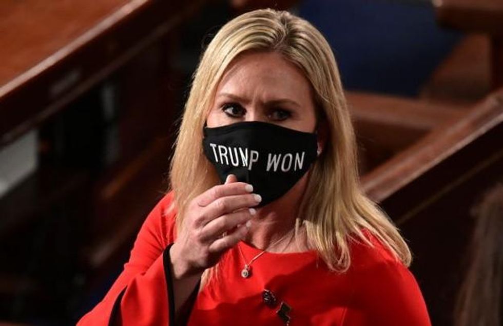 Despite stiff competition, QAnon clown Marjorie Taylor Greene clinches the Worst Person In Congress title with revelations she stays busy urging that leading Dems be executed, stalking survivors of school shootings she says were staged, arguing a laser beam from space caused California's wildfires and threatening to arrest reporters who ask her questions. Normal people say she must be expelled. The GOP leader plans to "have a conversation" with her. We suspect he'll leave his backbone at home.