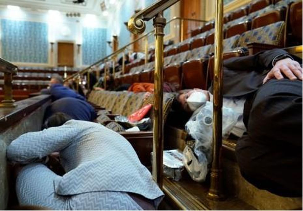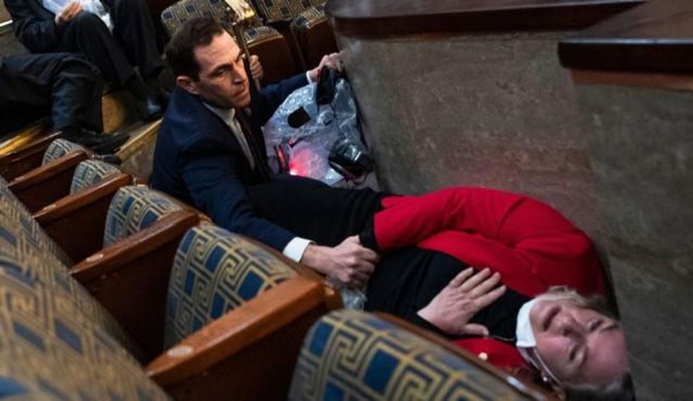 Colorado Rep. Jason Crow, a former Army ranger who saw combat, comforts Pennsylvania Rep. Susan Wild as they were trapped in the House Chamber. Photo by Tom Williams/Getty