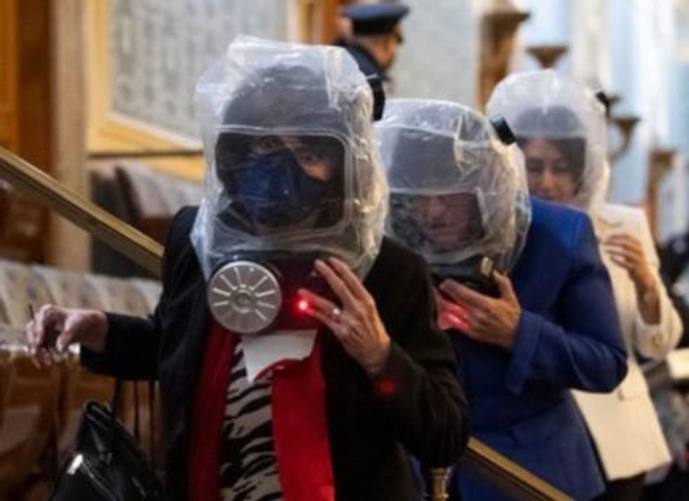 Gas-masked lawmakers exit the Chamber. Getty Image