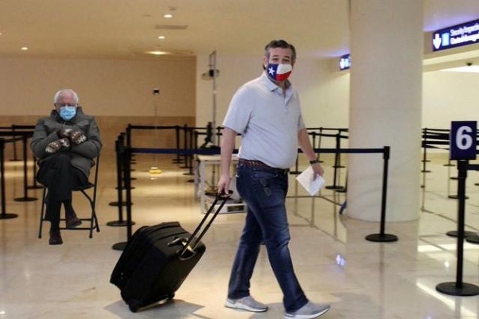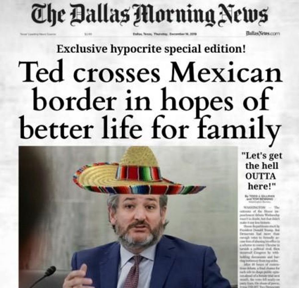 Man, Texas GOP pols are the crappy, clueless, self-serving gift that keeps on giving. Turns out Ted Cruz was in a no-witnesses hurry to abet and acquit the leader of a violent insurrection so he could swoop off to his sun-baked, taxpayer-funded beach vacation in Cancun, Mexico, and he was damned if he'd let the messy matter of a few million constituents huddling in the cold and dark and boiling snow for drinking water stop him. Thus was a pot-bellied Cruz outed in multiple images at Houston's airport - in a first class lounge, waiting on line, then on a plane, passport in hand. This from the guy who trashed Democrats for flying during a pandemic, who just told Texans to avoid icy roads and "stay home and hug your kids," who long urged we close the border with Mexico but who was now flocking there to have a better life with his family because conditions in his own state are dangerous and untenable, though he was embarrassed enough to not even tell his staff. Evidently only Ted Cruz is stupid enough to think he wouldn't be noticed en route, despite his wearing a mask he'd defiantly worn in D.C. reading, "Come and take it" - to which gun-control advocate Shannon Watts demurely asked, "You mean his job?" Even Fox News and other conservatives joined in the blowback - "The photos speak for themselves," "Ted Cruz flew to Cancun with his family amid power crisis in Texas," "Ted Cruz jets out to sunny Cancun as Texas shivers in the dark" - leading Twitter to suggest he did less damage when he was the Zodiac Killer.