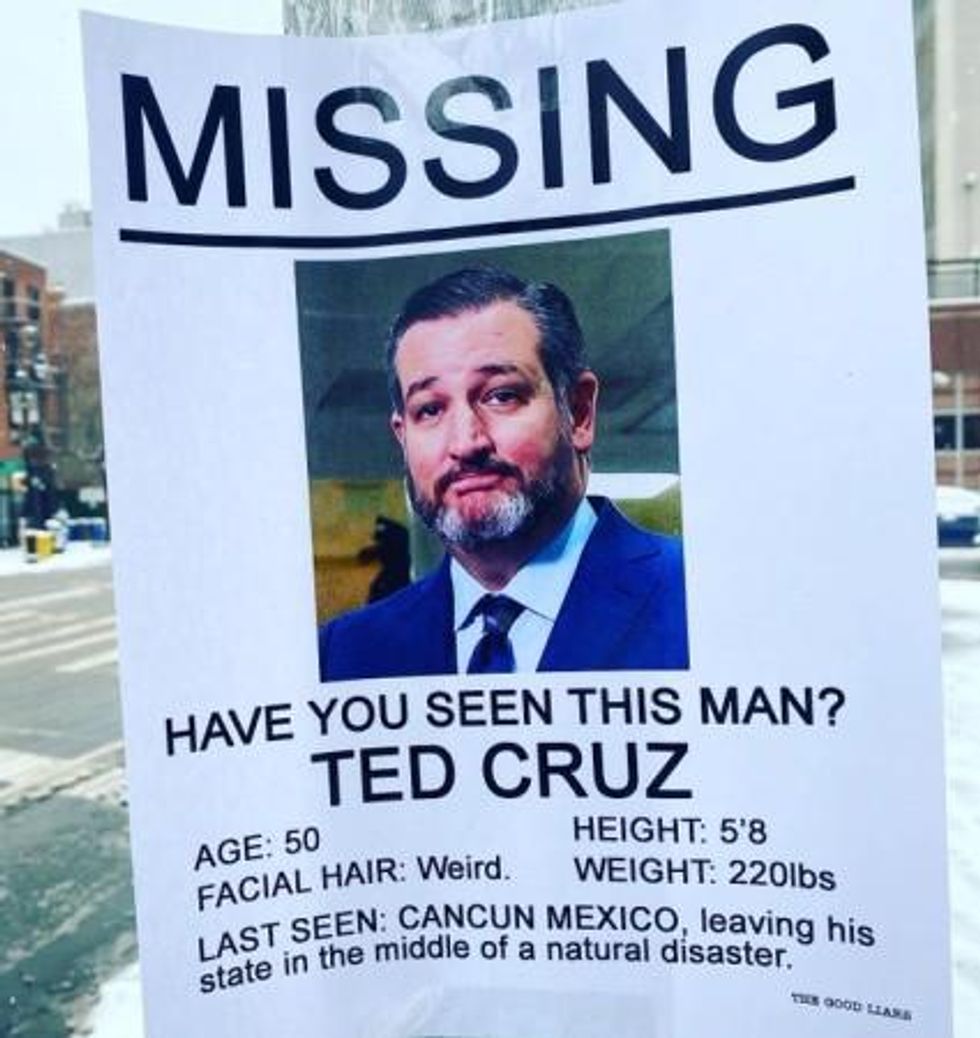 When he realized Planet Earth was responding with a furious WTF, Cruz backtracked as awkwardly and unconvincingly as only Lyin' - and now Flyin' - Ted could, issuing a statement full of ludicrous claims that carefully tried to toss his young daughters under the bus for peak performance so he didn't have to go there. His family lost heat and power too - he already said they didn't - with school cancelled "our girls asked to take a trip with friends" - because pre-teens always get to ask to go to Mexico on vacation - so "wanting to be a good dad" he flew down with them - though he was carrying a way-too-hefty-bag and CDC advises against nonessential travel including to Mexico and his Goldman-Sachs-wife sent out gleeful texts to friends asking if "Anyone can or want to leave for the week?" to join them at the posh RItz-Carlton on the beach - and he was coming right back - though sleuths found he was in fact booked through Saturday. Online, people were...unconvinced, though one noted it's a shame Texans can't heat their homes with gaslighting. "I too spent a week making sure my kids had fun without school in TX," wrote one aggrieved mom. "They shoveled snow into our bathtub, learned to light candles safely, learned to fill toilet water tanks with buckets, and learned to stand in very long grocery lines to get a 6-pack of drinking water." The hashtag #TedFled was busy; so was a fundraiser for Act Blue to put up Ted Fled billboards. Also busy, meanwhile, was the guy who Texas decided not to make their senator. While Slimy Ted was cozying up to the breakfast buffet in Cancun, Beto O'Rourke assembled an army of volunteers who reached out to over 150,000 senior citizens stranded in the crisis, working to get them food, water, rides to warming centers or whatever they needed. Yeah, nice call Texas.