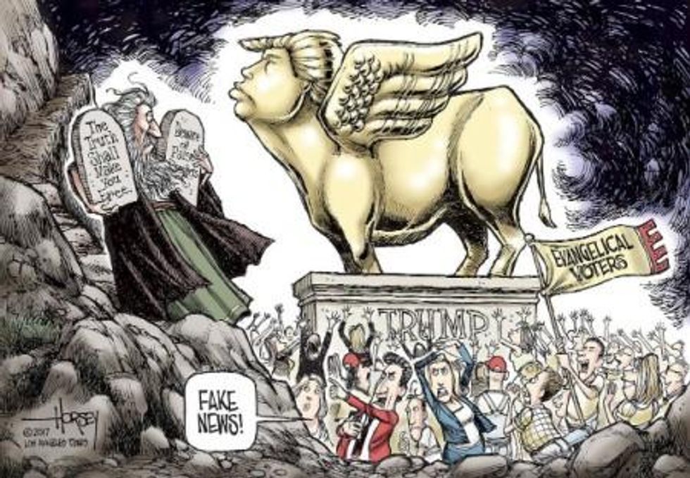Still, the highlight of the day was when they broke out the Golden Calf, a yuge gold statue of Trump in red tie, stars-and-stripes surfer shorts and flip flops, looking suspiciously like either Bart Simpson or Guy Fieri or Bob's Big Boy, holding a copy of the Constitution in one gold hand and a magic wand in the other. It was made - in Mexico it turns out - by Tom Zegan, a commercial artist and Trump fan who noted it has "all kinds of symbolism...A lot of thought went into it." Deep stuff: suit and tie=businessman, shorts=patriotic, sandals=retired, Constitution=he follows it. "And the people bowed and prayed/to the neon god they made": It got wheeled in and set up for gleeful selfies - win a t-shirt! - because somehow all these Evangelical Christians never got to the part in the Bible about false idols and graven images. It also quickly drew "a backlash of Biblical proportions." While the beast captures "the apocalyptic vibes" of Trump's presidency, it was generally agreed that, insofar as worshiping the golden calf was bad, "worshiping a golden jackass is worse." "If only there were some sacred text," mused one tweet, "one most people at CPAC claimed allegiance to, that very explicitly warns against making golden idols..." From BrooklynDad, "This reminds me of that religious story, something something something Golden Calf, something something graven image, something something false idols." Many just listed relevant Scripture passages: Exodus 32:8, Matthew 7:15, Jeremiah 14:14, Exodus 20:3: "And the Lord struck the people with a plague because of what they did with the (golden) calf Aaron had made." Cynics noted the statue's perfect for a group preparing to "wander the electoral desert for 40 years," or that it's "time for Moses to come down from the mountain and break some tablets." Still, the vulgarians of CPAC drank it up; on the video, they happily gush as it gets wheeled in. "Awesome," says one. Another: "That is so cool!" Not. Who are these fucking people, and can they leave our country soon, please?"