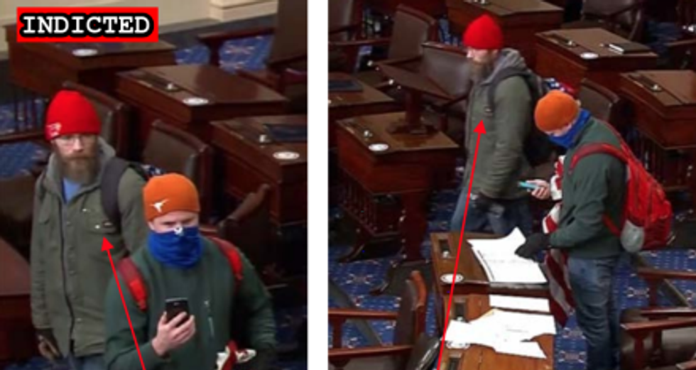 Also indicted was Josh Hughes (9 counts), Henry Muntzer (5 counts), Michael Foy, filmed beating a cop with a hockey stick (8 counts, and Samuel Camargo, who posted after the riot, "Just finished speaking to an FBI agent, I believe I've been cleared," 4 counts. One comment: "In a way you've been cleared; in another, more accurate way, you've been charged on four counts." Also charged was James Horning, who repeatedly videoed himself, often taunting police; at one point he lit up and declared, "Fuck it, smoking a joint on the Capitol steps right now." Oddly, none of these clowns - the cosplayers in green camo to match the Capitol's potted plants or with easy-to-spot logos on jackets or posting boastful selfies or mugging for the cameras - seemed to consider maybe #SeditionHasConsequences. They included Samuel Fisher, a self-described pick-up artist, who laid it all out and then some: He brought weapons, 1,000 rounds of ammunition, a bulletproof vest and vowed online, "The Deep State is arrested and hanged on the White House lawn for High Treason." When his neighbor videotaped the scene as armed FBI guys swarmed and ordered him spread-eagled on the ground, Fisher furiously sputtered, "What the fuck?!" - coincidentally, just like many of us watching these moronic yahoos as they fumbled to dismantle democracy.