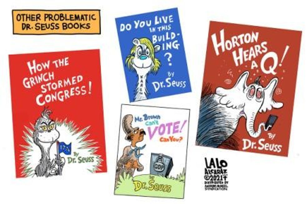 The GOP's growing ties to right-wing extremists and their rejection of any semblance of political governance is mirrored by the culture wars they keep pushing, because if you literally have no ideas or policies other than staying in power, lies and myths and white grievance is all you've got, and stoking the fires of division is way easier than getting things done. Thus we have Texas Gov. Greg 'No Masks' Abbott, who stalled getting COVID tests to migrants and now blames them for a surge; Fox' Tucker Carlson, who calls QAnon rioters "gentle people" and is "leaning even more heavily into its buffet of culture war cuisine"; and Kevin McCarthy, the finest exemplar of performative bullshit, who posted an excruciating video of himself reading "Green Eggs and Ham" to protest the "outlawing" of Dr. Seuss by radical Dems and their cancel culture, except it was the decision of Dr. Seuss Enterprises to stop publishing six of his 60-plus books due to racist images - Asians "with their eyes all aslant," Africans as cannibals - arguing they "portray people in ways that are hurtful and wrong, (and) profiting off books with racist imagery is not something we want to do." So: A private company made a decision, it does not involve Green Eggs and Ham, the Dems had nothing to do with it because they're busy doing their job, everyone seems to know that no one is canceling Dr. Seuss except McCarthy, who tried to cancel the election, and other "bad faith actors" who can't acknowledge that, "Racism is not an aberrant part of American life...it's a feature." People responded as you'd expect to an overpaid, oblivious clown who's voted against a living wage, health care, jobs and COVID relief reading a book that's still being published while ignoring the actual issue and the rest of reality: "Thank you sir, this is exactly what America is crying out for. Also, how many of your constituents went hungry today?" Also, "WTF is wrong with you?" and "Dr. Seuss would hate you bro" and "Yes, Dr. Seuss evolved. Anyone can." Except, evidently, Republicans. John Prine, as usual, was right: "Some humans ain't human."