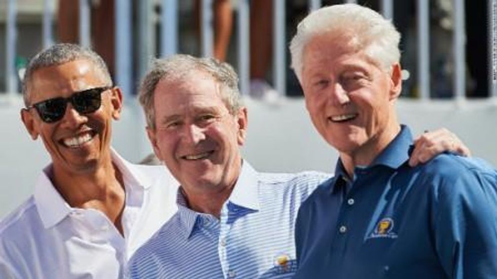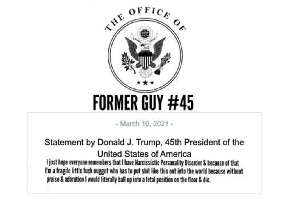 In hopes of spurring wary Americans to get the COVID vaccine, two national ad campaigns launched Thursday starring all four former presidents - Obama, Bush, Clinton, Carter - who along with their wives urge people, "The science is clear...This is our shot...Now it's up to you." A joint project of the Covid Collaborative and the Ad Council, a nonprofit that produces PSAs, the ads feature a one-minute spot showing them all being vaccinated, and a 30-second one of Clinton, Bush and Obama at Biden's inauguration, where Obama calls the vaccine "the first step to ending the pandemic and moving our country forward." Noticeably missing from this pageant of good will and commonality is the former guy, who secretly got vaccinated this winter. He issued a "statement" proving that once a sick, racist, subhuman ghoul, always a sick, racist, subhuman ghoul: "I hope everyone remembers when they're getting the COVID-19 (often referred to as the China virus) vaccine, that if I wasn't president you wouldnt be getting that beautiful "shot" for 5 years, at best, and probably wouldn't be getting it at all. I hope everyone remembers!" - a projectile so vile the person posting it felt compelled to add, "This 'statement' is REAL." Ignoring the lie - scientists had spent years preparing for what they assumed would be another pandemic - most people shot back with the obvious, obscene rejoinder: "I hope everyone remembers that if he weren't president there wouldn't be 528,000 American souls. May they Rest In Peace." There was also, "If we ignore him will he go away," "Pathetic," "Good lord, this man had the nuclear codes," and "Stop feeding the beast." Mostly, there was this: "I just hope everyone remembers I have Narcissistic Personality Disorder & because of that I'm a fragile litte fuck nugget who has to put shit like this out into the world because without praise & adoration I would literally ball up into a fetal position on the floor & die." Do, please.