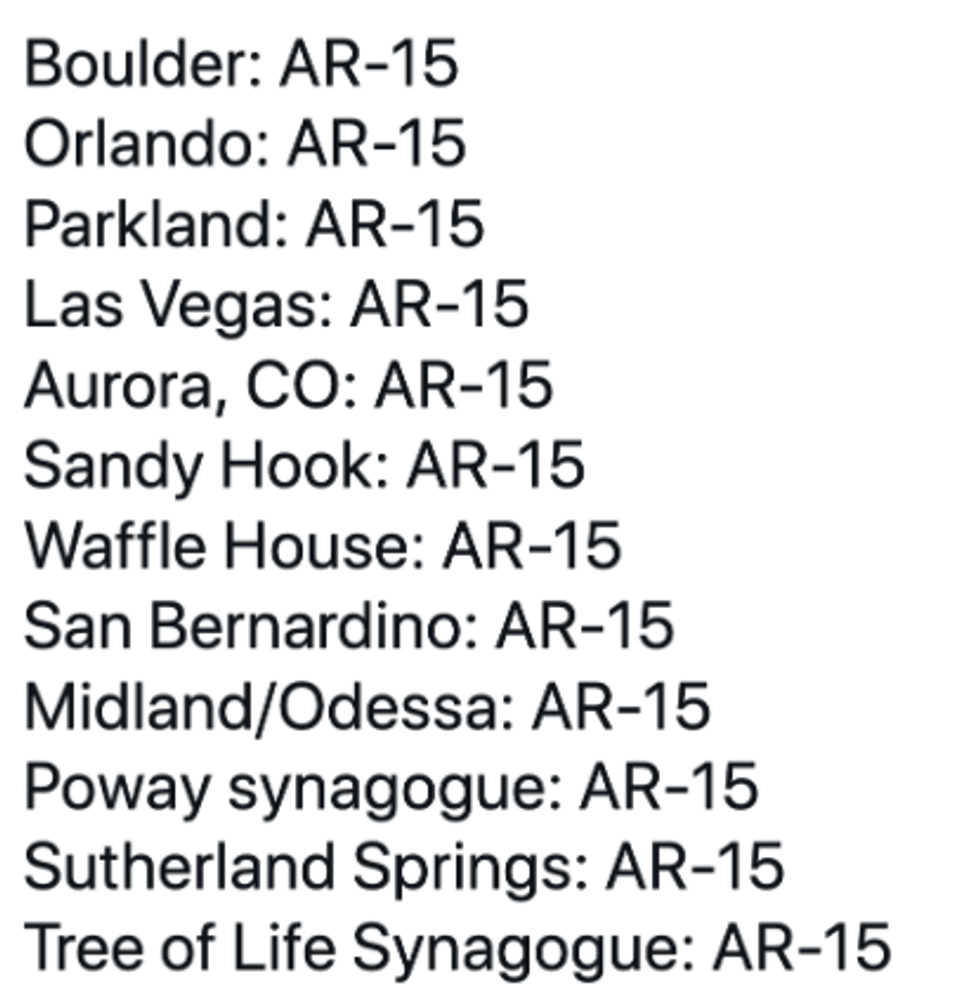 There's an especially infuriating backstory to the latest slaughter of 10 innocents in America, this time in the bubble that was Boulder, CO. Two years ago, after the mass shooting in Parkland, Boulder became the center of a landmark legal battle between the gun lobby and the city after Boulder's City Council passed two ordinances banning the possession of assault weapons and large-capacity magazines. Boulder is blue country; it's also in a state that's seen some of the country's most horrific mass shootings, including Columbine - after which the GOP shielded gun manufacturers from lawsuits - Planned Parenthood, the Aurora theater, and a STEM school in Highlands Ranch. In response to the ban, a right-wing group backed by the local, always hungry-for-bloodNRA brought a lawsuit against it and any other potential local weapons ban, arguing Boulder was "putting gun owners back into a closet, and that goes against everything Boulder claims to stand for" - a bizarre claim about such a crunchy-peace-and-love-flavored town. But last Thursday a district judge, who may or may not be one of the many judges with ties to the NRA-funded, pro-gun front group Law Enforcement Alliance of America, said the city "cannot prohibit the possession or sale of firearms." Citing a 2003 state law enacted by a GOP legislature that preempts cities and towns from restricting assault weapons, Judge Andrew Hartman ruled Boulder's "provisions are invalid and enforcement of them is enjoined" because only state or federal law can enact common-sense measures against mindless mass murder that work and over 80% of America supports.