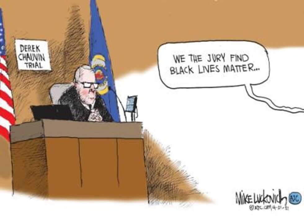 The jury verdict that former cop and unrepentant sociopath Derek Chauvin is guilty three times over on all possible charges - twice for murder, once for manslaughter - for killing George Floyd over the sickening nine minutes and 29 seconds of savagery we all saw brings a measure of solace and hope. Finally, a killer cop in America, one of too many, has been found to be a killer cop. Finally, a jury rejected all the racist buzzwords and smears - struggles with drugs, "resisting" arrest, bad health, no tail light, running or sleeping or looking suspicious or the perils of a "hostile crowd" in a "densely populated urban environment" - that they didn't with Terence Crutcher, Botham Jean, Freddie Gray, Philando Castille, Breonna Taylor, Eric Garner, Oscar Grant, Elijah McLain, Tamir Rice et al. "Justice For Them All," read one righteous sign at Monday protests by thousands of Minnesota teenagers reluctantly taking on adult fights. This time - with that truth-telling video and even fellow officers breaking the blue line of silence - the lies didn't work. "You were told (Floyd) died because his heart was too big," said prosecutor Jerry Blackwell in closing arguments. "The truth (is) George Floyd is dead because Mr. Chauvin's heart was too small." Holding Floyd facedown on the pavement that day as he battled to breathe, added prosecutor Steve Schleicher, "did not require one ounce of courage. All that was required was a little compassion, and none was shown...This wasn't policing. This was murder." Guilty. Guilty. Guilty.