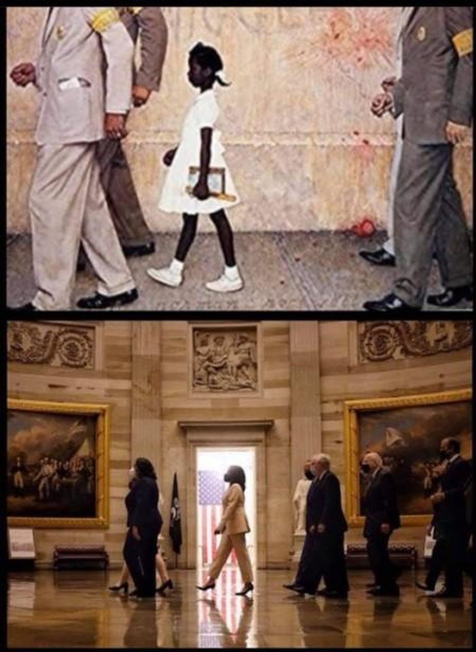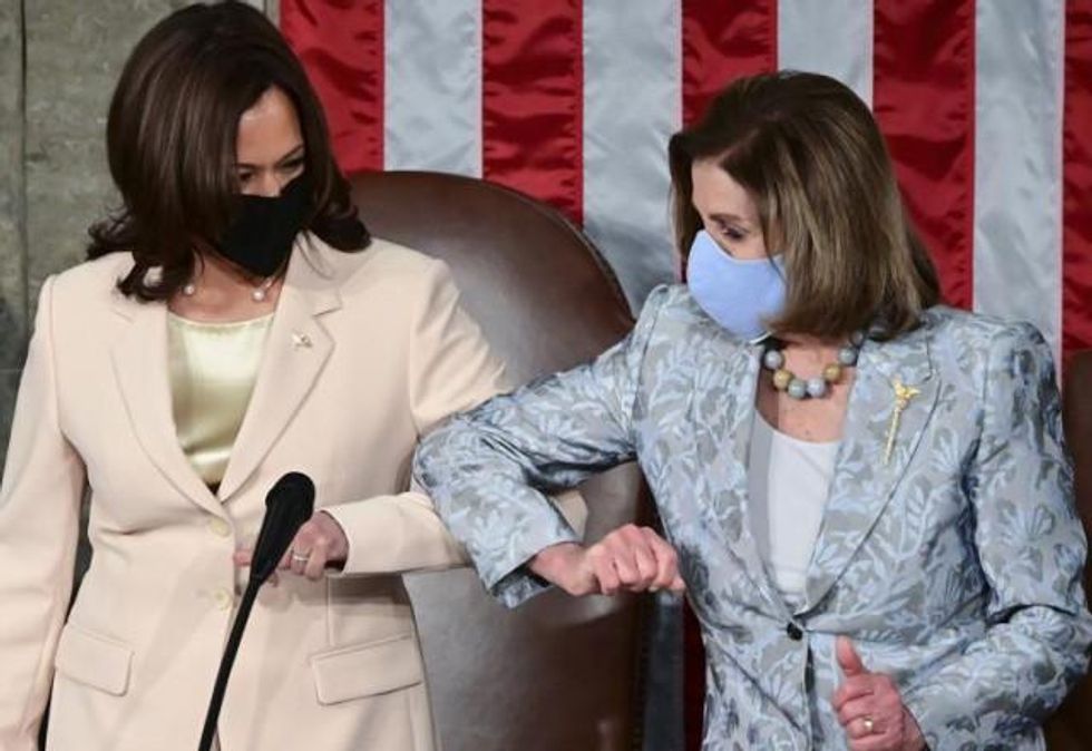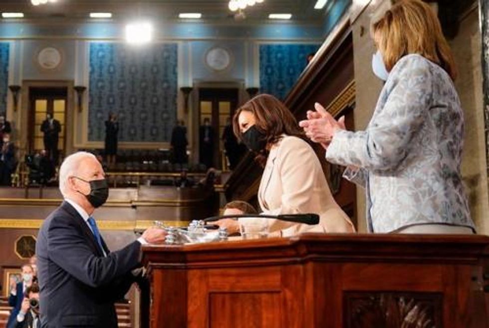 We're just gonna leave this photo here of two smart, tough, accomplished women - one of color, and the first and second in line of succession to the U.S. presidency - on the House dais before Joe Biden's first prime-time speech to a joint session of Congress, which opened for the only time since the reign of George Washington with the mellifluous if woefully belated phrase, "Madam Speaker, Madam Vice-President." The media termed the presence of Kamala Harris and Nancy Pelosi, two powerful women - so close yet so far - in the machinery of American government such as it is, "historic." But we prefer Harris' depiction when asked the significance. "Normal," she said.