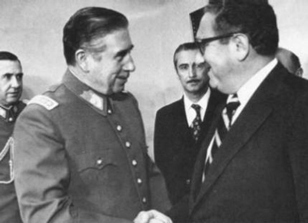 Pinochet greets Henry Kissinger, right-wing dictators' best friend