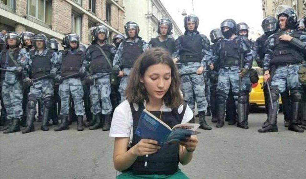 Amidst a widening Russian crackdown on dissent, 19-year-old Olga Misik - who two years ago was infamously arrested for reading aloud her country's constitution to a phalanx of glowering riot police at a pro-democracy rally - was sentenced Tuesday to two years of "freedom limitation" for vandalism at a protest with two other activists. Now a journalism student at Moscow University, Misik became a Tiananmen-Square-like symbol of resistance during 2019 protests against the barring of Kremlin critic Alexei Navalny and other dissidents from city elections when she sat on the pavement before rows of Terminator-looking special forces and calmly, defiantly read from the Russian Constitution. For many, the startling sight of a slight 17-year-old girl in sneakers and bullet-proof vest arrayed against Putin's thugs was instantly iconic, and she became known as the girl with the constitution; her fame spread when she was arrested in chilling video. It was then she met the two other activists - Ivan Vorobyovsky, now her best friend, and Igor Basharimov, now her boyfriend - with whom she's been on trial. During a subsequent protest last August against Navalny's arrest and abuse in prison, all three were charged with vandalizing a government building after they hung a banner and splashed red paint on a security booth outside the Prosecutor General's Office. Prosecutors said they caused 3,500 rubles ($47) in damages; the defense argued the paint was water-soluble, no damage was done, and, in Misik's words, the case "is punishment for our thoughts."