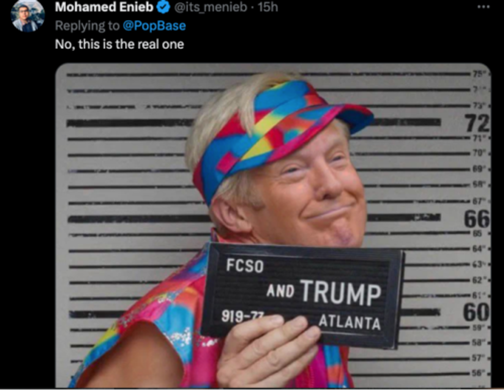 The pointedly, theatrically glowering image - Never Surrender! except four times - was released Thursday evening after Trump was booked at the Fulton County Jail on 13 felony counts stemming from his efforts to overturn the results of the 2020 presidential election in Georgia, even though no other sentient being wanted him to be president. He and 18 other lowlife perps had been ordered to turn themselves in by Friday at the notoriously grim jail where DOJ officials just opened an investigation after “credible allegations that an incarcerated person died covered in insects and filth."