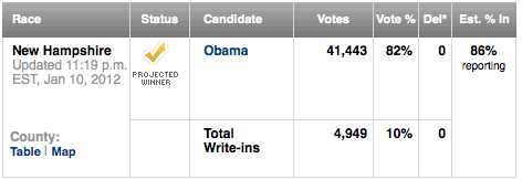 As expected, millionaire Mitt Romney, former Massachusetts Governor (and New Hampshire summer resident) has won the New Hampshire Republican primary tonight with 39% of the vote. And, in the low-enthusiasm Democratic primary, millionaire President Obama was receiving 82% of the vote - with 10% of Democrats writing in other names.