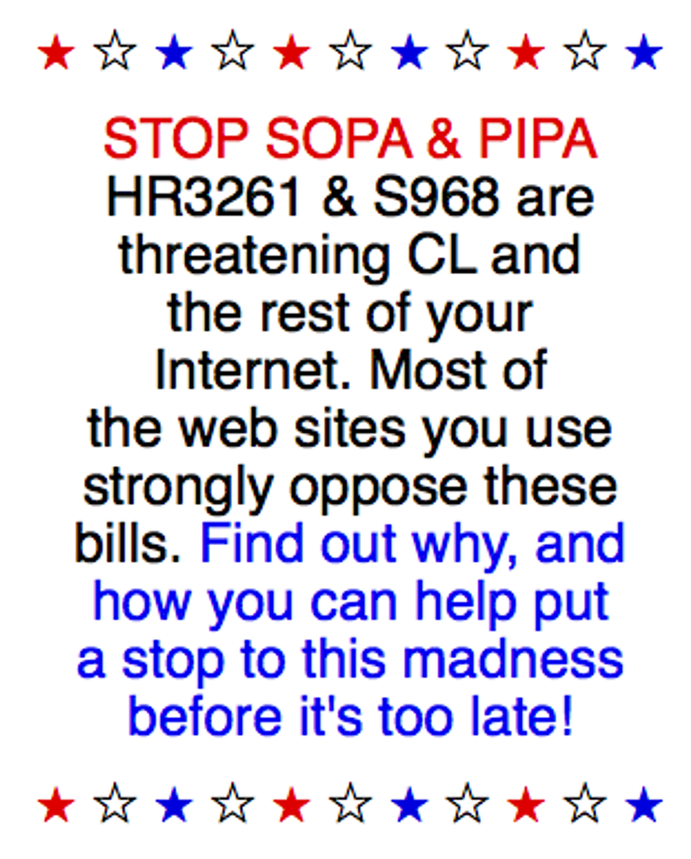 Craigslist, like other sites, has posted information on its homepage to educate and activate its users about SOPA and PIPA.