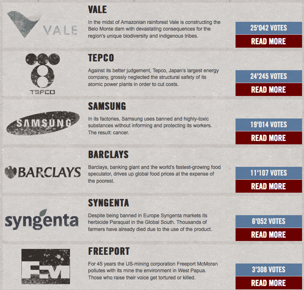 Public Eye Awards: Mining Giant Vale and Barclays Top Corporate Villian List