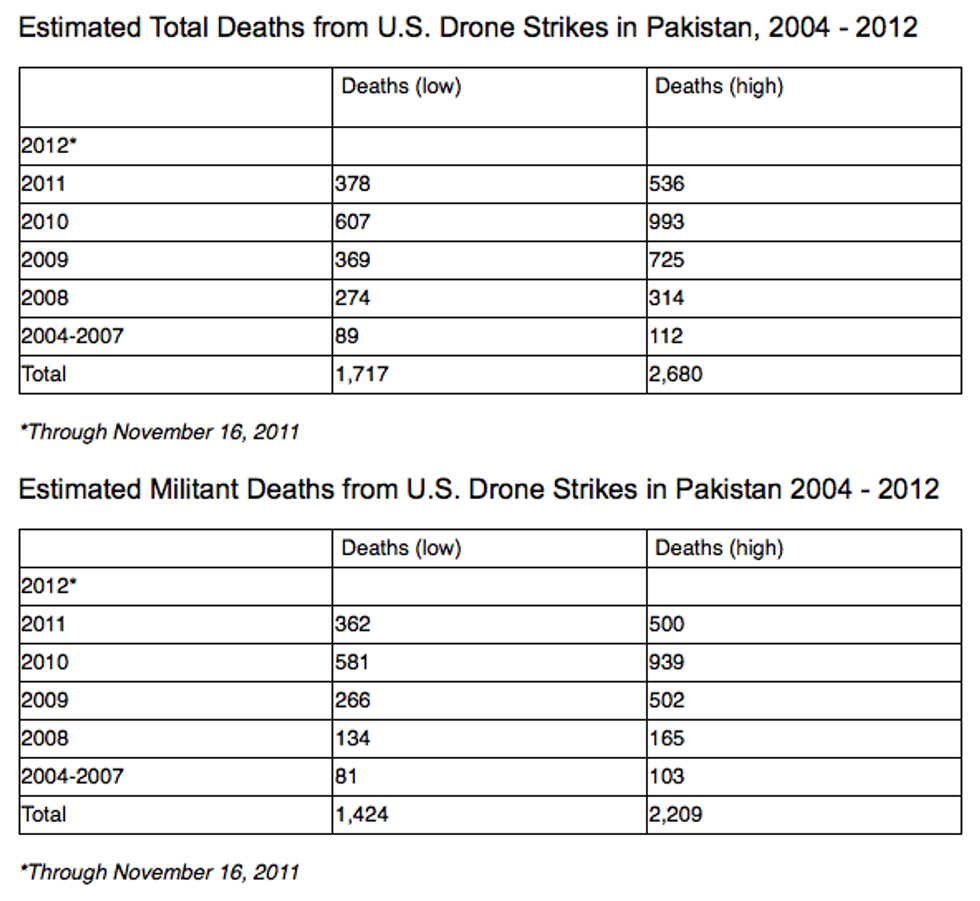 Our study shows that the 283 reported drone strikes in northwest Pakistan, including 70 in 2011, from 2004 to the present have killed approximately between 1,717 and 2,680 individuals, of whom around 1,424 to 2,209 were described as militants in reliable press accounts. Thus, the true non-militant fatality rate since 2004 according to our analysis is approximately 17 percent. In 2010, it was more like five percent.*