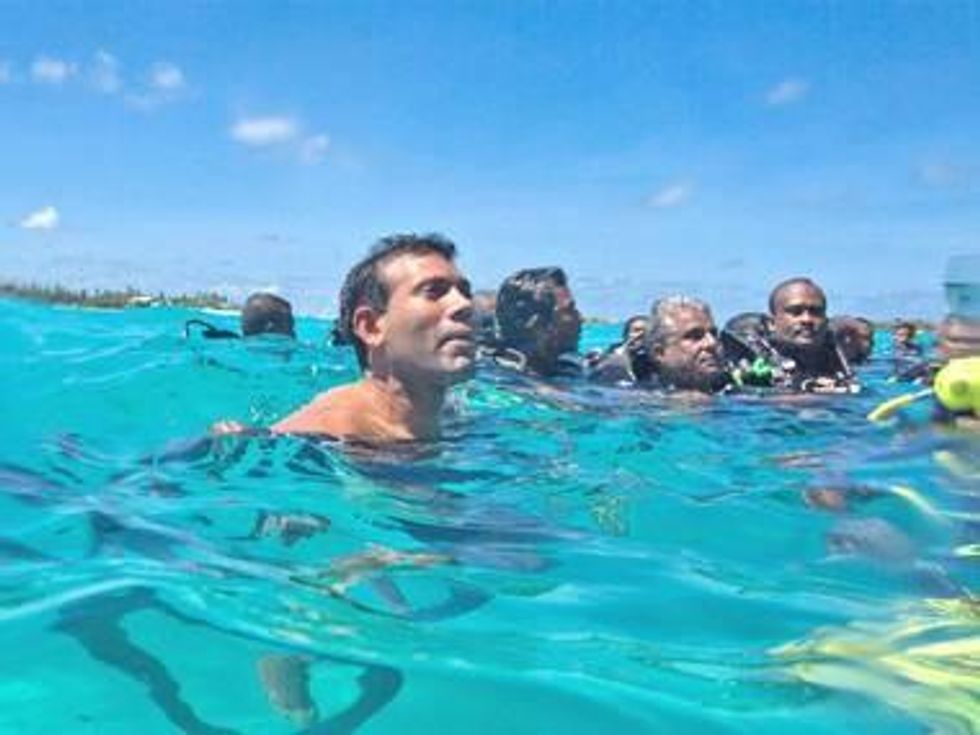 He held a cabinet meeting underwater in scuba gear to dramatise the threat of rising oceans to his low-lying archipelago nation, 80 per cent of which is no more than a metre above sea level, and said he might need to relocate his entire population if nothing was done. He also announced plans to make his nation carbon-neutral, using wind and solar projects.