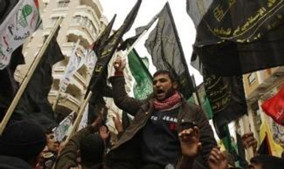 At least 5,000 people took to the streets of Gaza, waving a mix of black Jihad flags, the green flags of Islamist group Hamas and the yellow flags of the secular Fatah movement of Palestinian President Mahmoud Abbas.