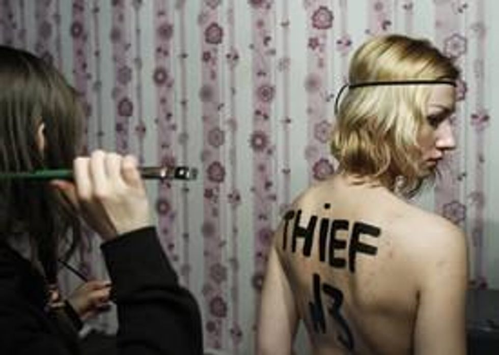 Naked theft. That appeared to be the message a group of women's rights activists were trying to convey Sunday in protesting Russian Prime Minister Vladimir Putin's attempt to return to the Kremlin for a third term.
