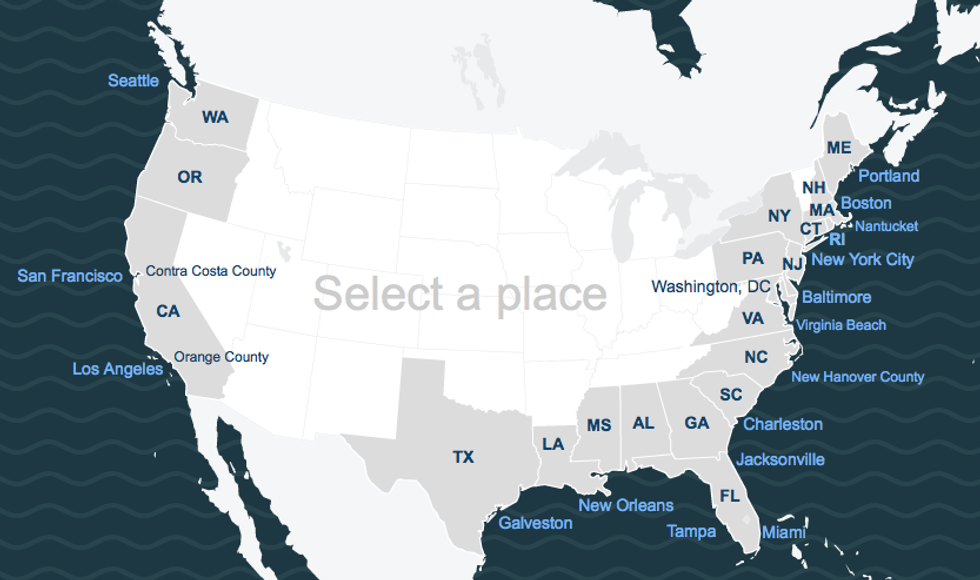 An interactive map creating to mirror the research shows potential flooding in specific states and coastal areas: