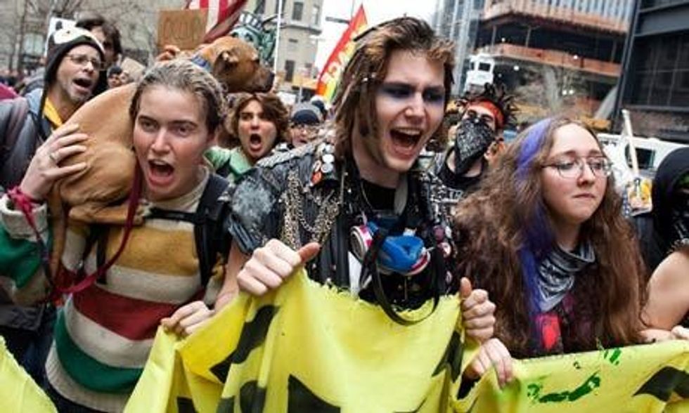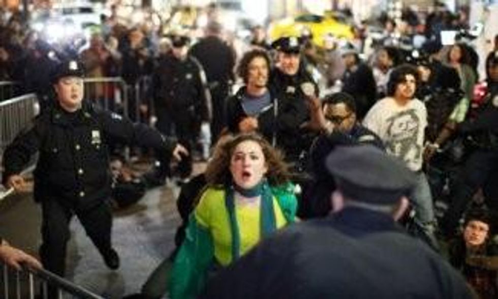 The rally was inspired by Saturday's mass arrest of at least 73 Occupy protesters in lower Manhattan. Many Occupiers have described the evening as one of the most violent police crackdowns since the movement began in September.