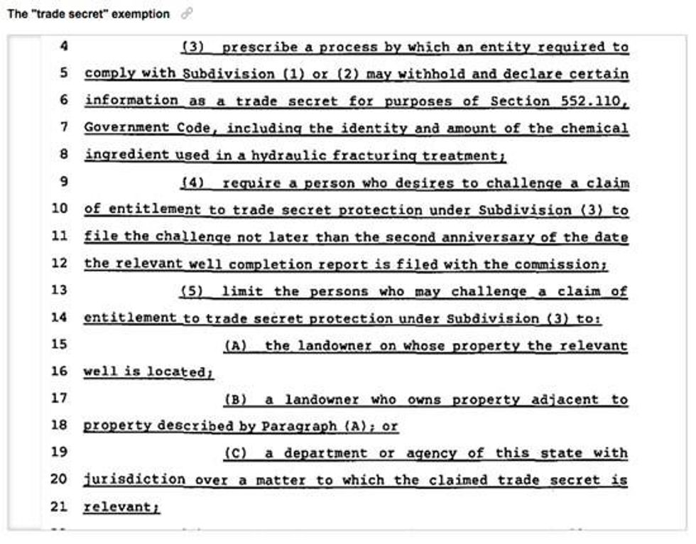 The Texas law, which ALEC cites in the post as its template, codifies the trade secrets exemption, and who can challenge it: