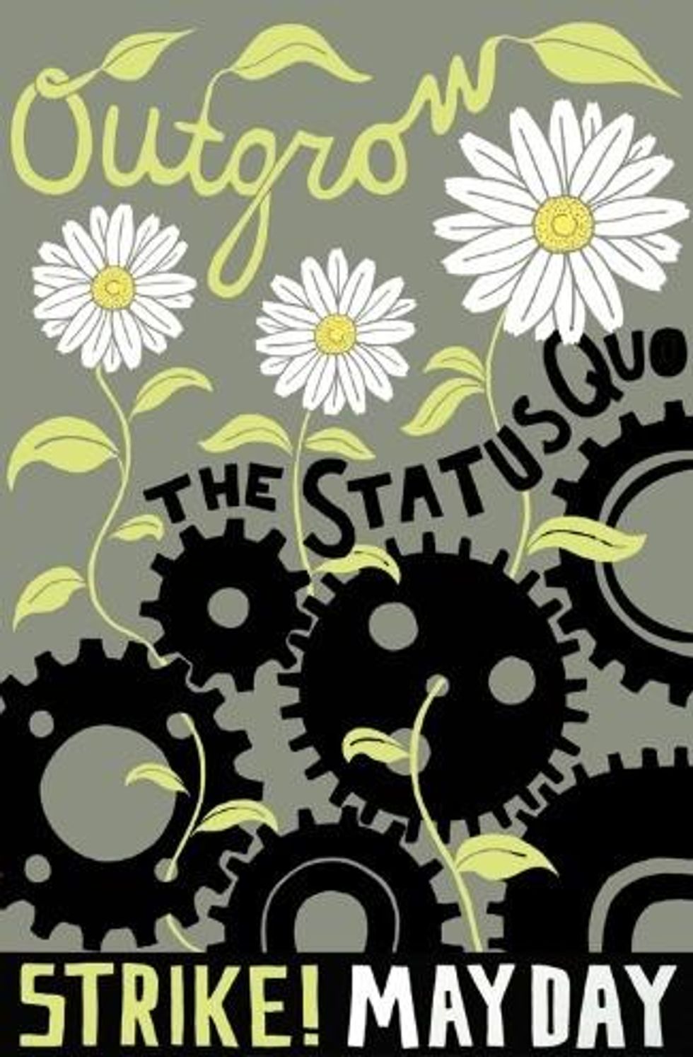 The official OWS press release about May Day mentions the phrase "general strike" twice: once in the headline, and once in quotation marks in the first paragraph. Perhaps keenly aware of the likelihood that an across the board labor strike is not only unlikely but illegal, the day is now being described by organizers as a nationwide protest with themes of economic non-compliance. (Poster by Nina Montenegro, via Occuprint.)