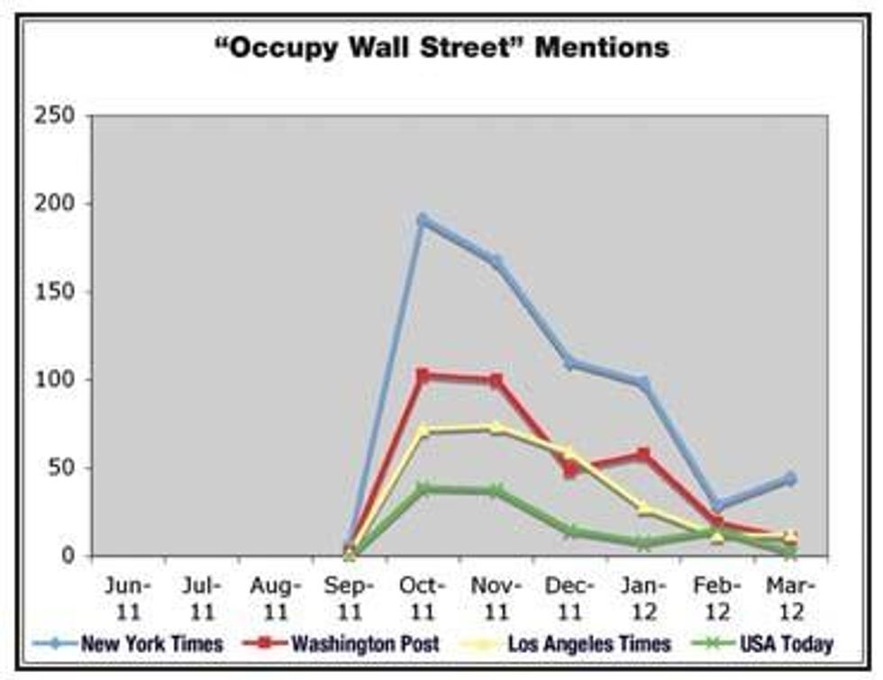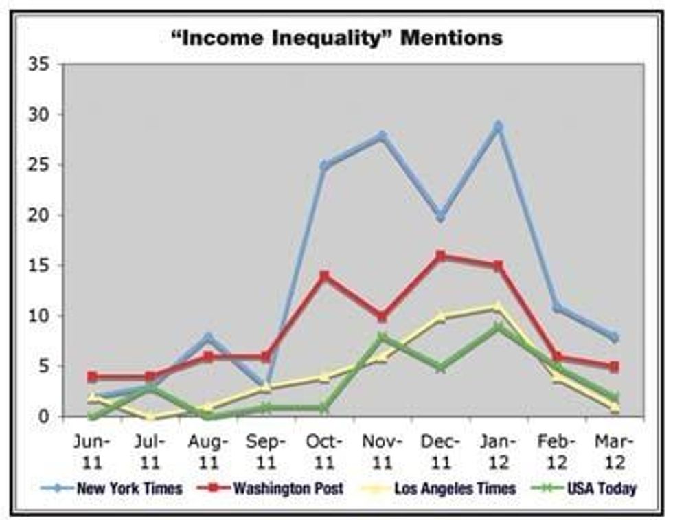 By March, there were only 16 mentions of "income inequality," half from the New York Times--which also far outpaced the other papers in coverage of OWS that month, at 45 mentions to the L.A. Times' 12, the Post's 10 and USA Today's three, due in part to the scores arrested in New York City on the movement's six-month anniversary on March 17.