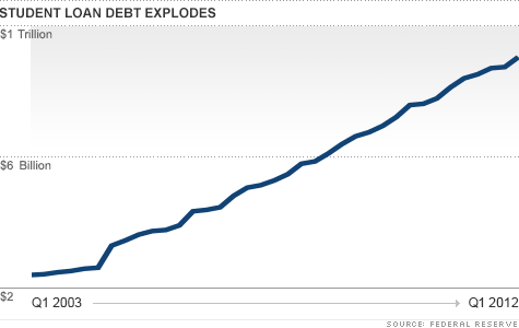 Student loan debt hit $904 billion in the first quarter of 2012, up from $241 billion a decade ago, according to the Federal Reserve Bank of New York quarterly household debt report. That's up 275% since the same period in 2003. [...]