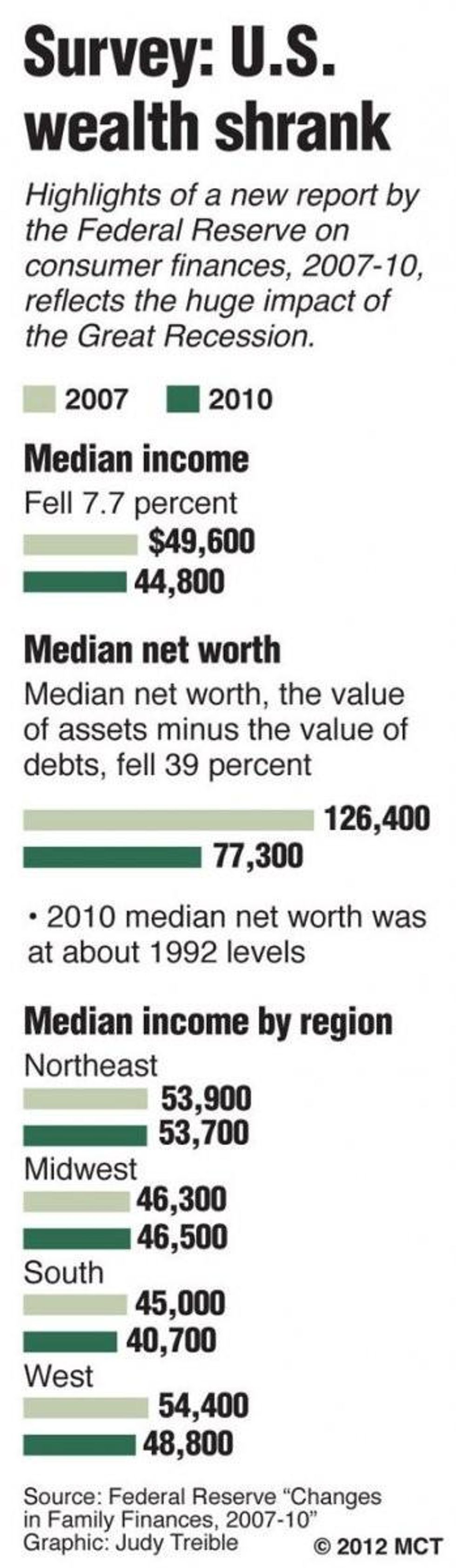 The Fed found that median net worth fell 38.9 percent_ from $126,400 in 2007 to $77,300 in 2010. That essentially took net worth back to levels recorded in 1992, and reflects the steep erosion of housing wealth. Middle-class Americans have a greater proportion of net worth tied up in their home than do the rich.