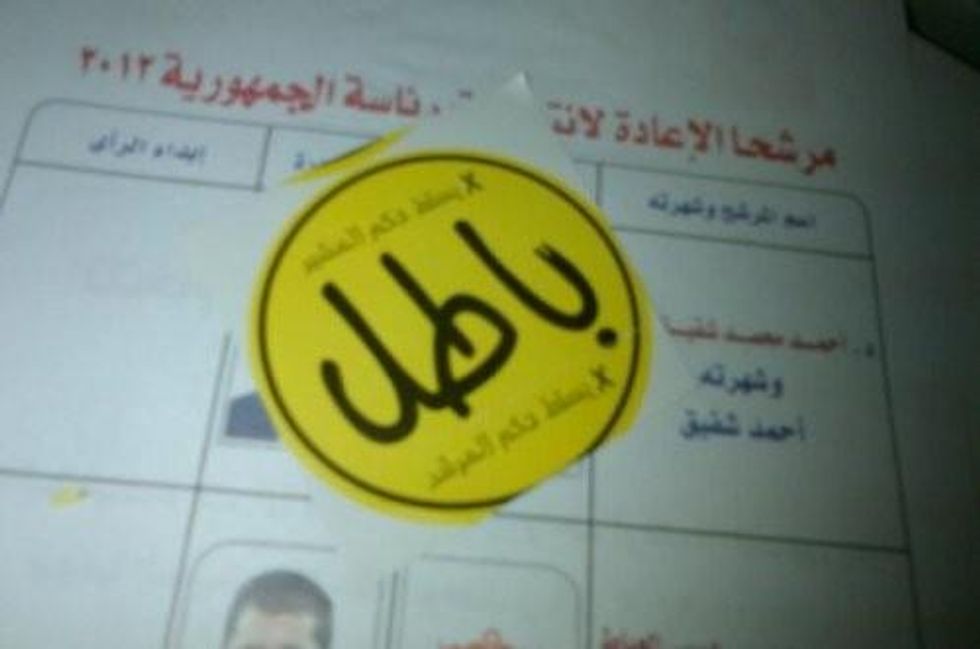 Amira Salah-Ahmed, the former business editor at the Daily News Egypt and founder of the Egypt Monocle, posted this picture of her ballot, spoiled with a sticker that is being widely distributed and calls the election "illegitimate".