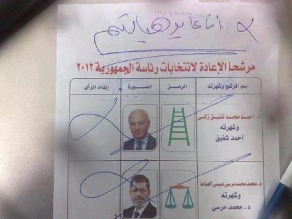 Shahir, a Twitter user passed on this picture of a spoiled ballot where both candidates had been marked and crossed out and "I want Hayatem" written above. Hayatem is a favourite Egyptian belly dancer. "The revolution continues," Shahir quipped.