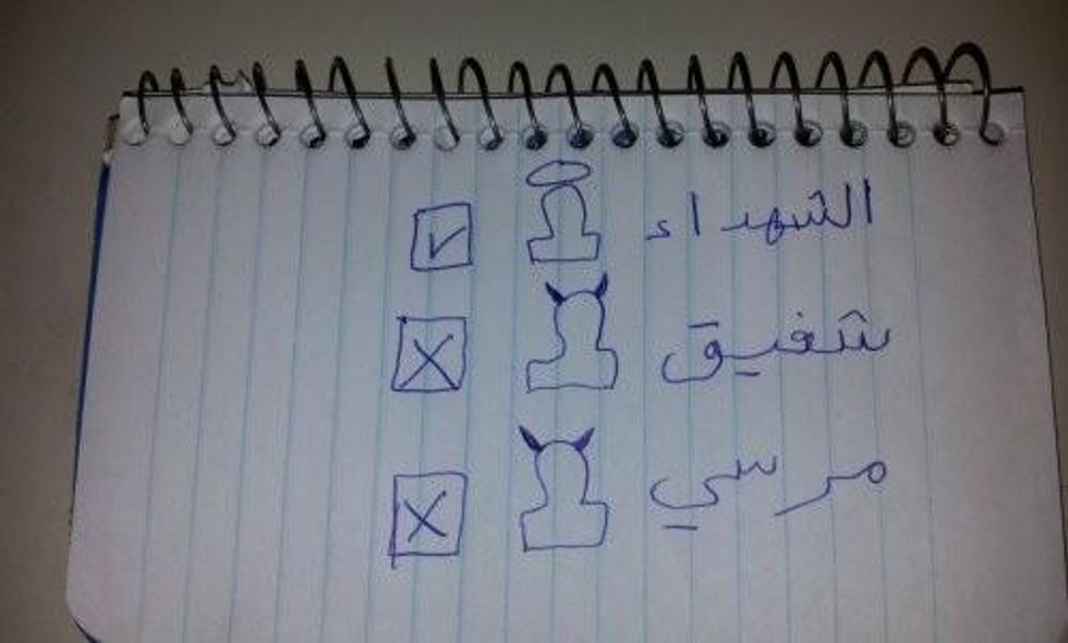 Karim Maher said he had drawn devil horns on both candidates' heads, then written his own entry for "The Martyrs," which he checked.