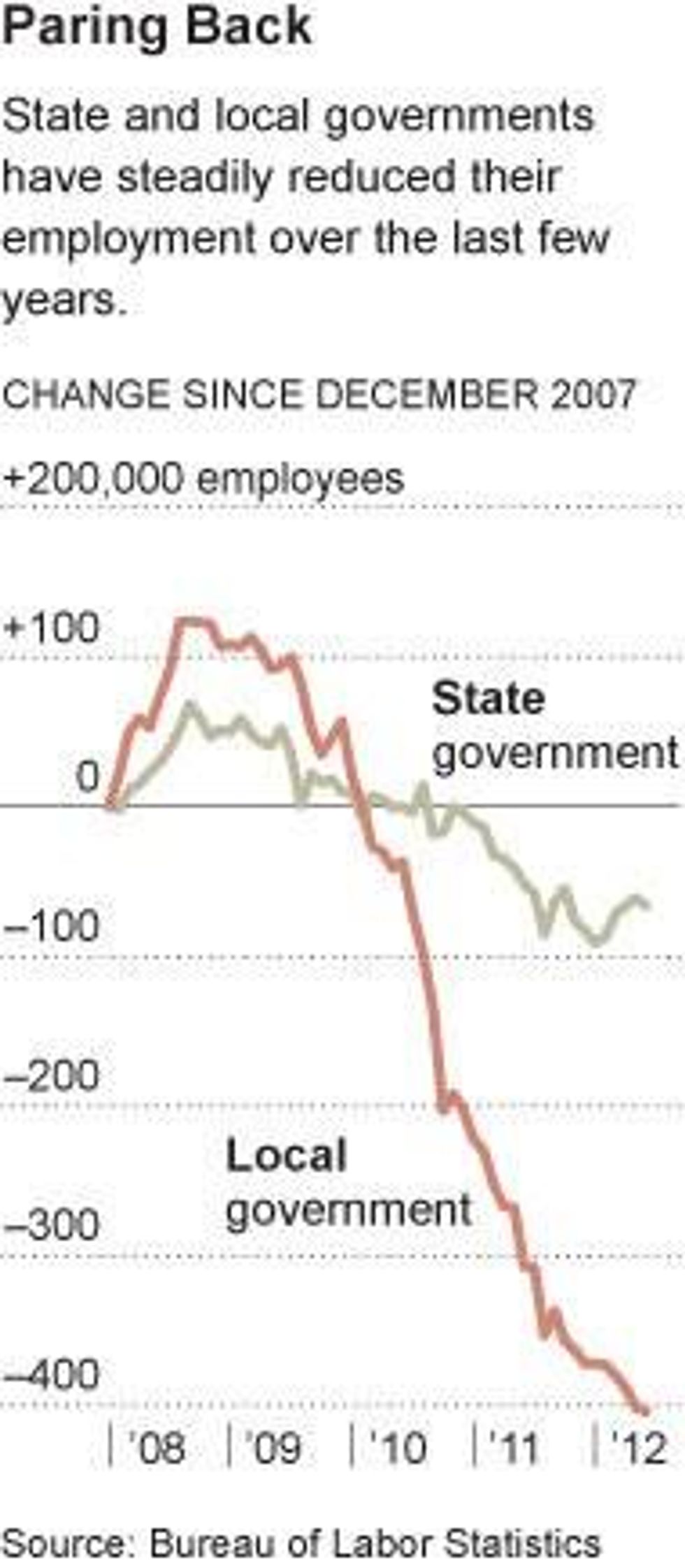 Government payrolls grew in the early part of the recovery, largely because of federal stimulus measures. But since its postrecession peak in April 2009 (not counting temporary Census hiring), the public sector has shrunk by 657,000 jobs. The losses appeared to be tapering off earlier this year, but have accelerated for the last three months, creating the single biggest drag on the recovery in many areas. [...]