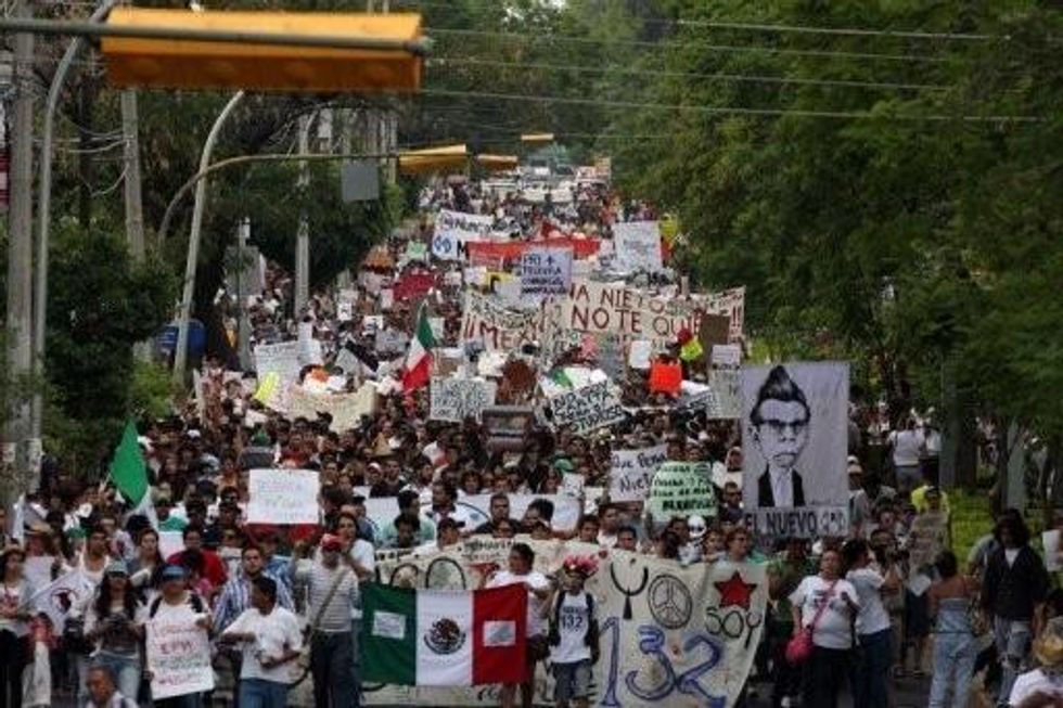 Members of the "Yosoy 132" (I Am #132) movement demand fair broadcasting and electoral coverage during 90,000 strong protest in Guadalajara city, Mexico on June 10, 2012.