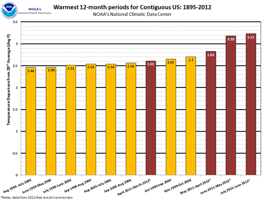 - The July 2011-June 2012 period was the warmest 12-month period of any 12-months on record for the contiguous U.S., narrowly surpassing the record broken last month for the June 2011-May 2012 period by 0.05degF. The nationally-averaged temperature of 56.0degF was 3.2degF above the long term average. Every state across the contiguous U.S. had warmer than average temperatures for the period, except Washington, which was near normal.
