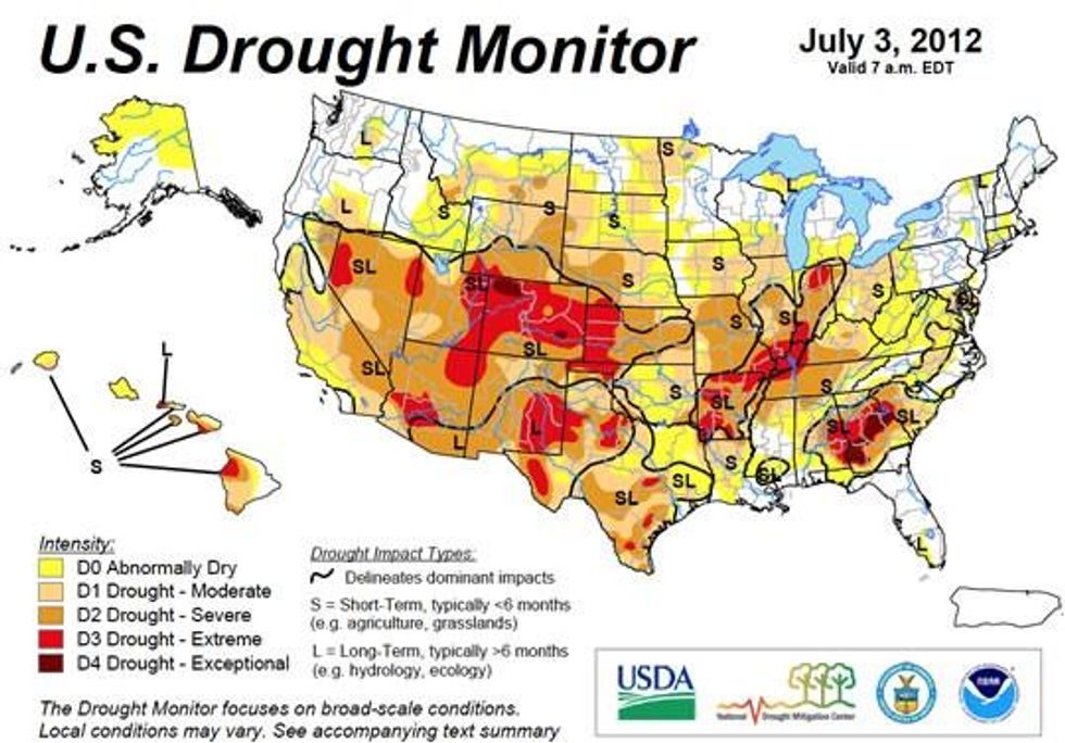 - According to the U.S. Drought Monitor, as of July 3, 56.0% of the contiguous U.S. experienced drought conditions, marking the largest percentage of the nation experiencing drought conditions in the 12-year record of the U.S. Drought Monitor. Drought conditions improved across Florida, due to the rains from Tropical Storm Debby. Drought conditions worsened across much of the West, Central Plains, and the Ohio Valley, causing significant impacts on agriculture in those regions.