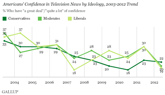 Confidence in television news also declined across the ideological spectrum, though the decline in confidence among liberals and moderates was far more severe, putting their outlook below that of conservatives for the first time since 2007. Nineteen percent of liberals expressed confidence in television media, versus 20 percent of moderates and 22 percent of conservatives.