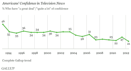 Only twenty-one percent of the 1,004 adults polled said they had "a great deal" or "a lot" of confidence in television news media, continuing a steady decline from the 46 percent who expressed confidence in television media in 1993.