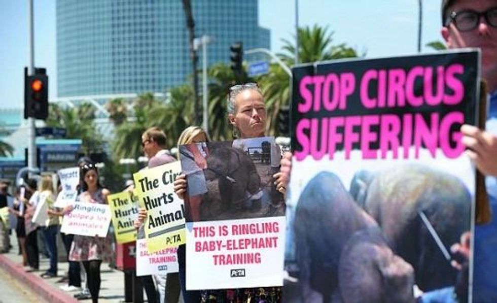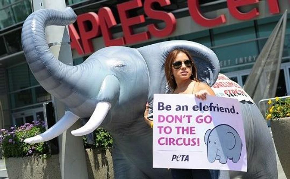 PETA spokesman Matt Bruce called on all people -- young and old -- to boycott Ringling Bros. and argued there is no such thing as a humane circus that uses animal performers. Bruce said the baby elephants on display inside Staples Center were "torn from their families, forced to perform under the threat of extreme punishment, gouged with bull hooks, and even tied to the concrete floor of a barn for up to 23 hours a day to break their spirit."