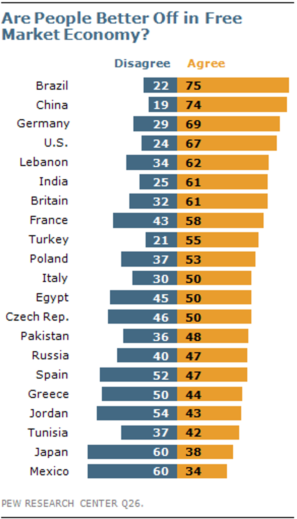 According to a new global poll by Pew Research, only half or fewer -- in 11 of 21 nations surveyed -- now agree with the statement that people are better off in a "free market" economy than in some other kind.