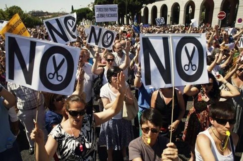 The austerity measures were announced last week by prime minister Mariano Rajoy. Since the announcement, protests have broken out on an almost daily basis. Thursday's demonstrations, however, were the largest--swelling after Rajoy officially passed the measures through parliament with the aid of his center-right Popular Party.