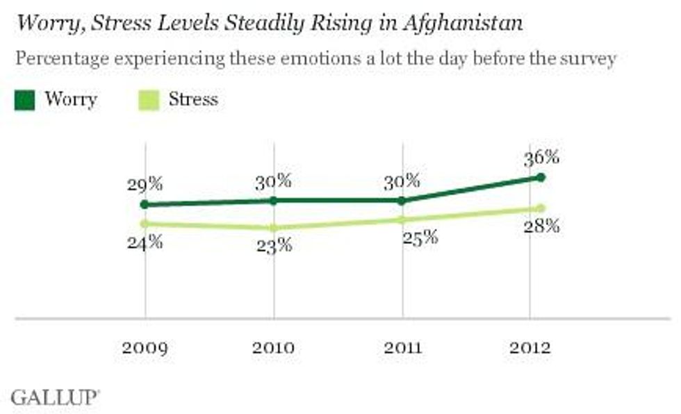 Afghans' outlook for their future also remains near its lowest point since Gallup began asking 'life outlook' questions in 2008. In addition, the stress of living in a war zone and uncertainty about the war's outcome creates tremendous daily stress. According to the poll, "Afghans are also more likely to say they experience stress and worry, according to 2012 data. More than one in three (36%) report feeling worry during a lot of the day prior to the interview, and 28% report feeling stress a lot of the previous day."