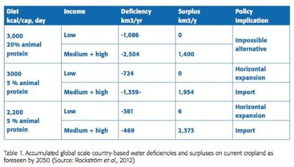 "[T]here will not be enough water available on current croplands to produce food for the expected population in 2050 if we follow current trends and changes towards diets common in Western nations (3,000 kcal produced per capita, including 20 per cent of calories produced coming from animal proteins). There will, however, be just enough water, if the proportion of animal based foods is limited to 5 per cent of total calories and considerable regional water deficits can be met by a well organised and reliable system of food trade."