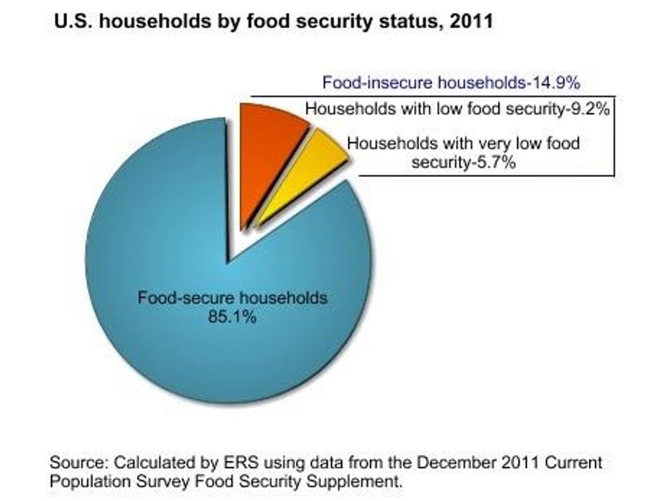 Of that nearly 15%, 5.7 percent (6.8 million), were classified as having very low food security, meaning "normal eating patterns of one or more household members were disrupted and food intake was reduced at times during the year" due to lack of resources. This represents an increase from the 2010 level of 5.4 percent.