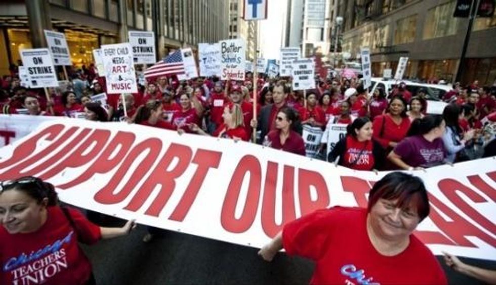 As In These Times reporter Mike Elk writes, the striking teachers in Chicago have "quickly changed the political conversation from Democrats vs. Republicans to how both parties attack unions."