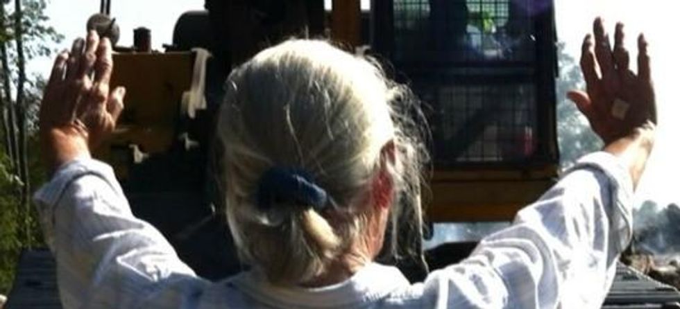 UPDATE 3:40PM - Daryl has been arrested for helping Eleanor defend her farm from toxic tar sands. Eleanor defiantly standing her ground with arms raised to halt TransCanada's machinery.