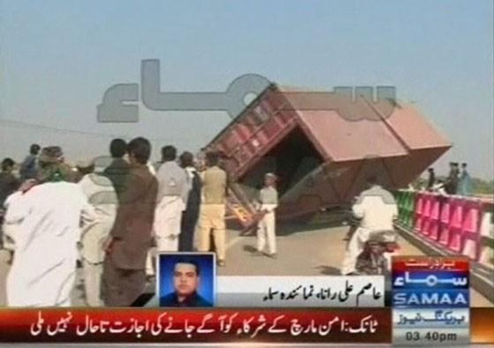 On Sunday, however, the caravan was met outside of the region by the Pakistani military, who blocked the road with steel shipping containers and hundreds of police in riot gear.