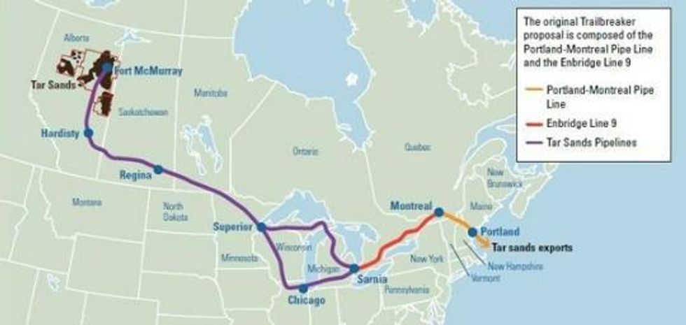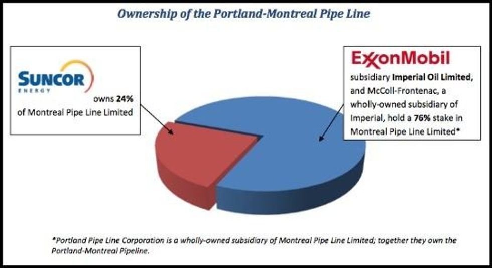 "Unbeknownst to most of the public," said the groups in a statement, "a major portion of the proposed tar sands pipeline that would cut across the Great Lakes, Ontario, Quebec and New England to Portland, Maine, is actually owned by oil giants Exxon-Mobil, Imperial Oil, and Suncor Energy - all of whom have a deep stake in tar sands extraction."